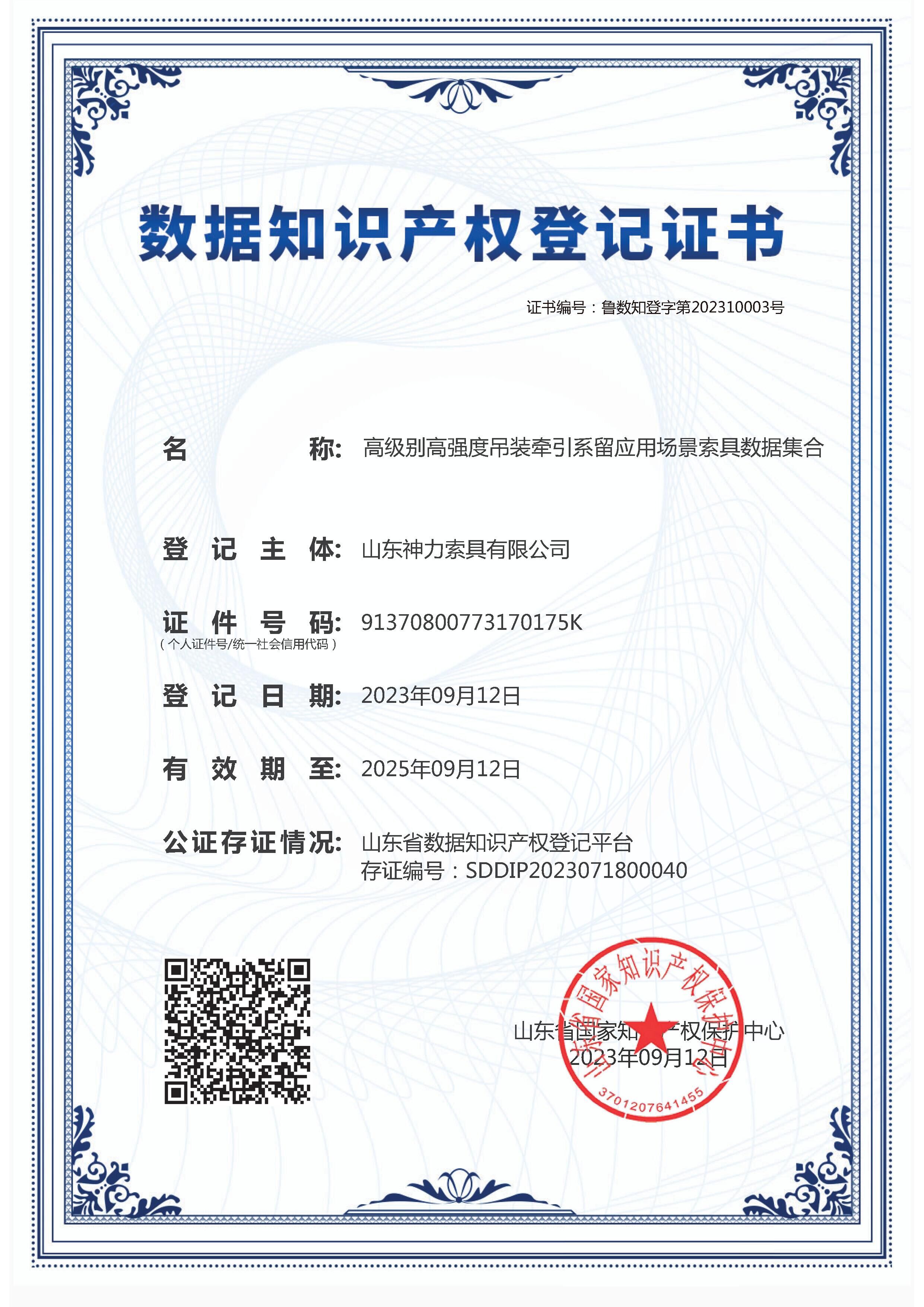 經(jīng)過前期在山東省數(shù)據(jù)知識(shí)產(chǎn)權(quán)登記平臺(tái)進(jìn)行數(shù)據(jù)知識(shí)產(chǎn)權(quán)的存證上傳、登記管理、逐級(jí)審核、確權(quán)出證、信息公示等環(huán)節(jié),9月12日,神力索具順利獲得山東省國家知識(shí)產(chǎn)權(quán)保護(hù)中心數(shù)據(jù)知識(shí)產(chǎn)權(quán)登記證書!該證書是濟(jì)寧市在數(shù)據(jù)知識(shí)產(chǎn)權(quán)登記中的第一張證書,也是山東省第三張數(shù)據(jù)知識(shí)產(chǎn)權(quán)登記證書。